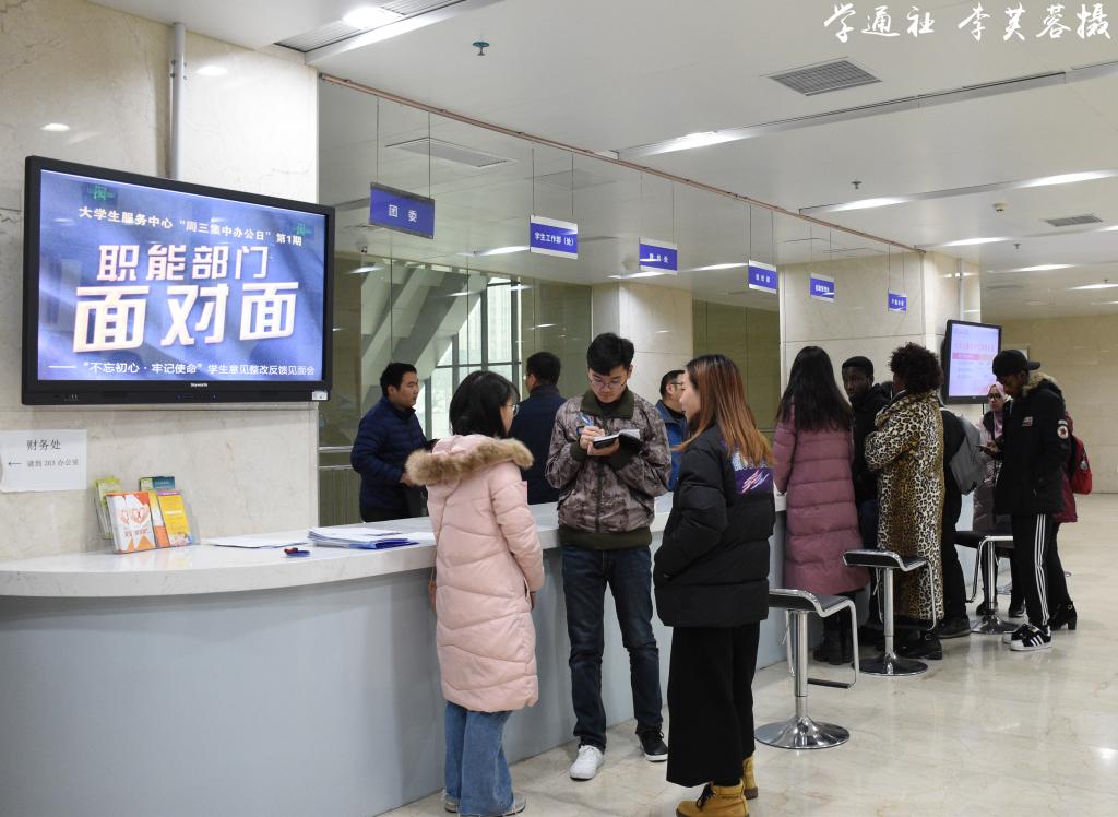本网讯(全媒体中心记者 薛广君 李芙蓉)“学校的田径运动场什么时候改造翻新?是否可以在场地周边加装储物柜减少学生在运动活动中物品丢失的风险?”“汇智公寓晾晒区太少,能否考虑增设?”“能不能拓宽二课学分的申请渠道?”11月27号,科教楼三楼的大学生服务中心,交谈声热火朝天。此处正在进行职能部门面对面“不忘初心、牢记使命”学生意见整改反馈见面会,服务台内侧由组织部、教务处、学工处、团委、后勤处和保卫处负责人组成的“答疑团”,另一侧是关心学校发展建设的大学生“提问团”,双方就在校学生的学习、生活问题进行现场答疑和意见反馈。此活动属于大学生服务中心“周三集中办公月”第一期活动。