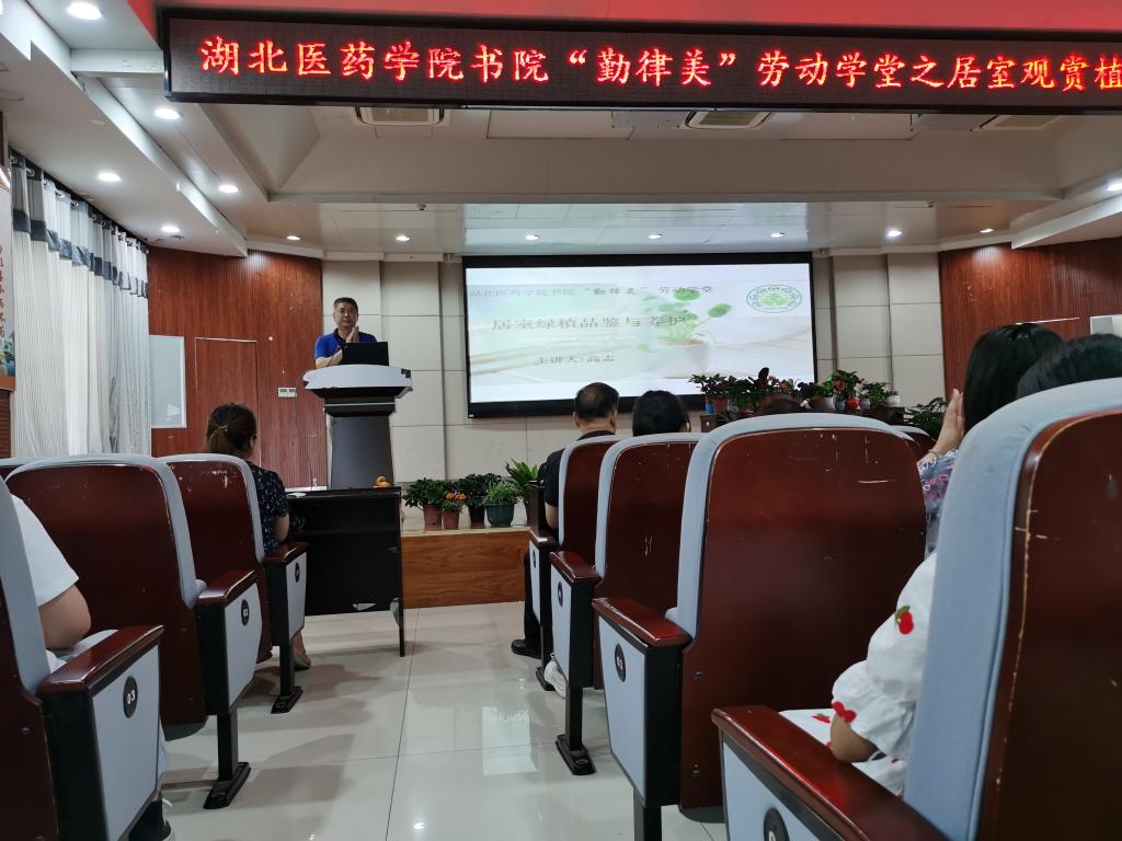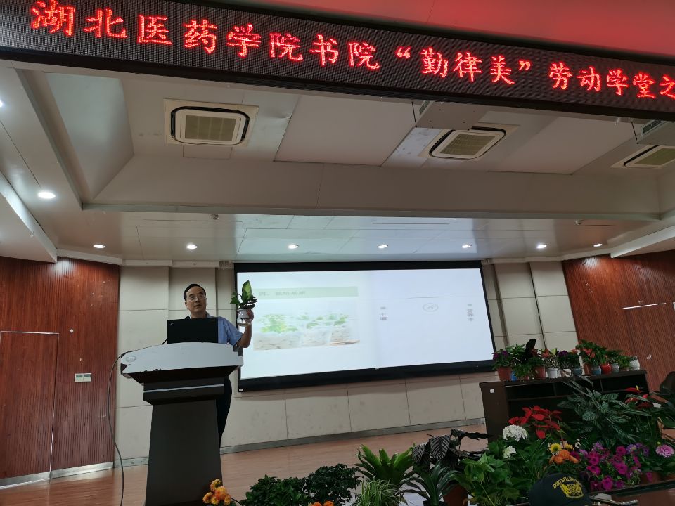 这是6月4日下午在八号楼五楼多功能厅举行的书院“勤律美”劳动学堂《居室观赏植物的品鉴与养护》专题讲座的场景。湖北高禾园林有限公司总经理高志应邀作讲座。现场摆放室内观赏花卉80余盆,将整个舞台装点成了花团锦簇的植物王国。讲座由精诚书院、精勤书院、精术书院主办,后勤管理处承办。300余名师生聆听讲座。