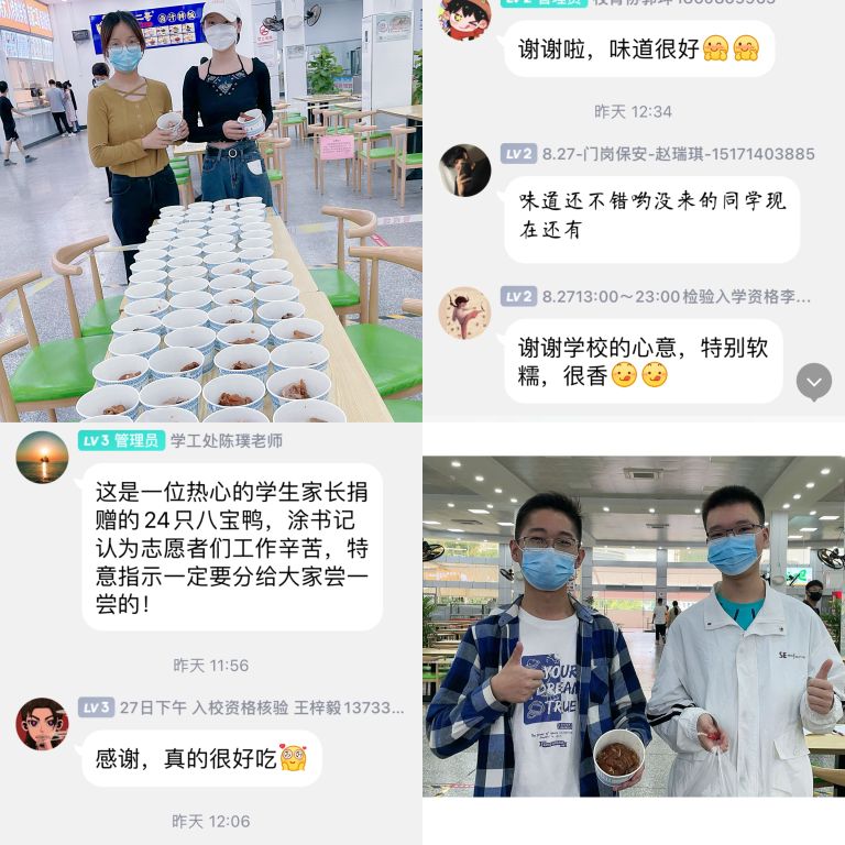 齐心同欲者胜,同舟共济者赢。“这是我吃过的最好吃的八宝鸭”学生志愿者小李端着“爱心鸭腿”兴奋地比了个赞!这是一位来自我校学生家长的爱心捐赠,校党委书记涂汉军和党委副书记、校长王云甫特别嘱托学工部要将这份爱心传递给本次在返校复学一线的志愿者们,最是父母心,枝叶总关情,爱心家长们不仅是物质上的支持,更是精神上的鼓舞。