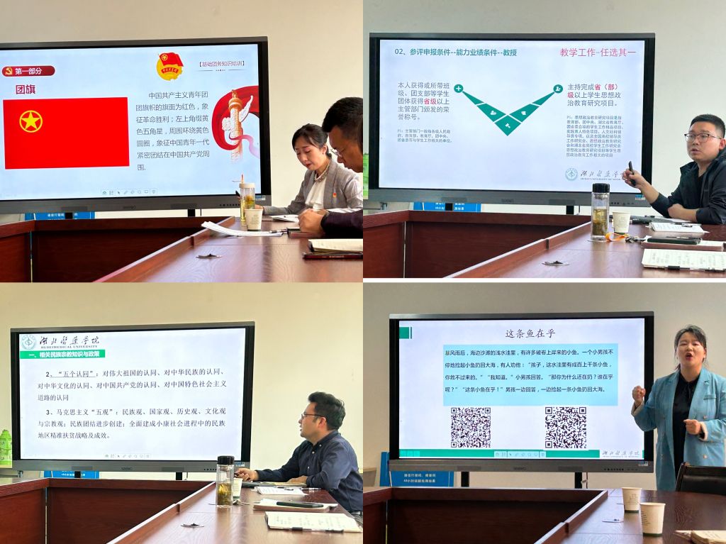 心理健康教育中心张秋月老师简要介绍了我校学生心理健康状况、就简单识别异常心理现象学生和应对方法作了分享交流。校团委郭俊老师以题为《用光点亮光,用爱指引爱》激励辅导员老师们要“用功”“用心”“用爱”帮助学生成长成才。学生管理科陈胜敏老师以《弹好思政工作“钢琴曲”奏好学生管理“黑白键”》为题,引导辅导员们要把思想政治教育工作贯穿在学生日常管理工作的始终,统筹协调好各项工作,逐个突破高效完成。校团委钟骅老师介绍了我校共青团工作体系、改革与发展和学生会组织改革的工作重点。学生管理科朱鹏老师从辅导员职业发展的角度解读了辅导员系列职称评审工作政策。学工处阿卜杜海拜尔·杰力力老师分享了少数民族大学生教育管理的方式方法,助力少数民族学生的健康成长。