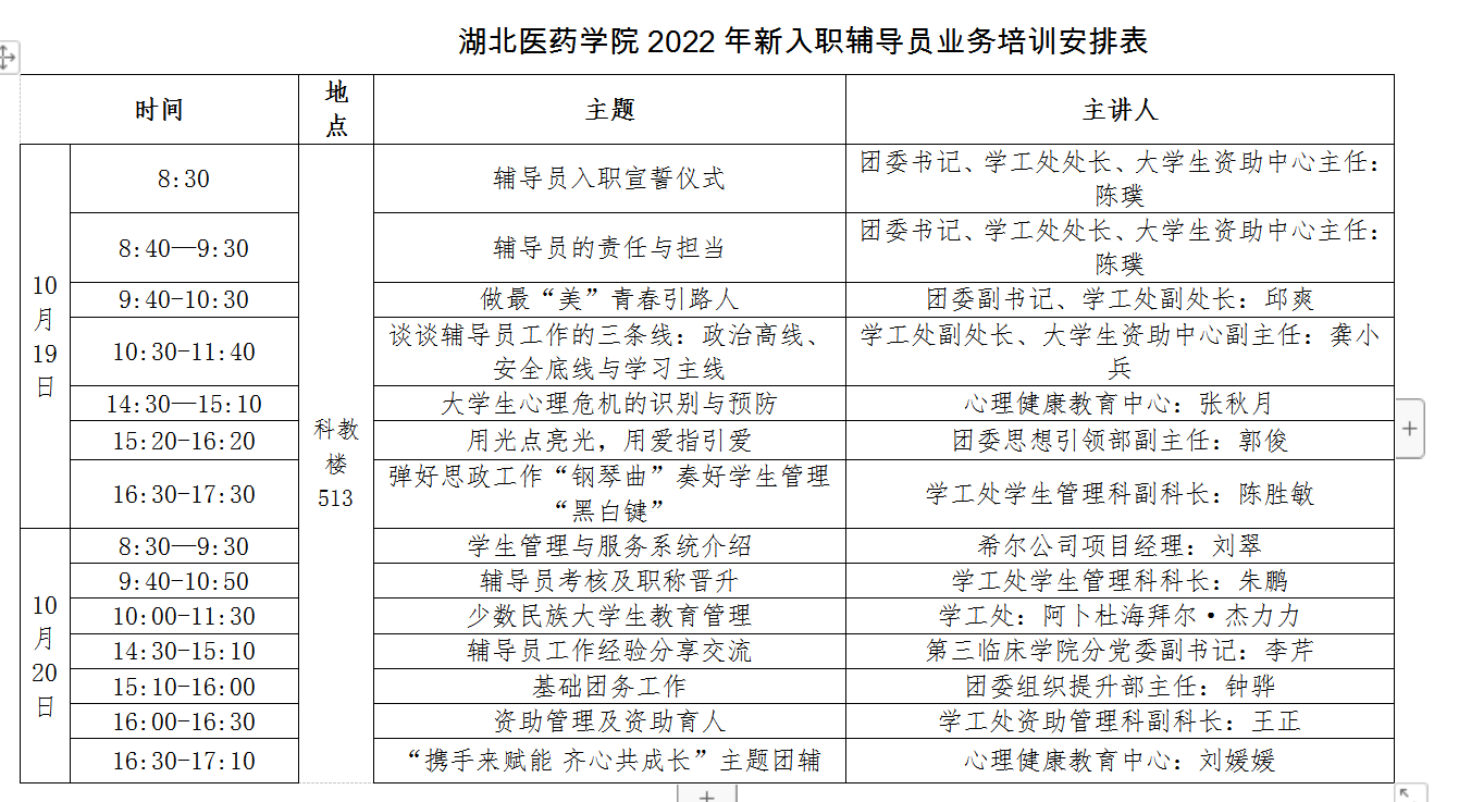 本网讯(通讯员 陈胜敏)10月19日-20日,学工部组织开展了为期2天的新入职辅导员业务培训,14名新入职辅导员参加了培训。本次培训涵盖专题报告、经验交流、分享沙龙、心理团辅等环节,全方位保障新入职辅导员在专业化、职业化道路上不忘初心,行稳致远。