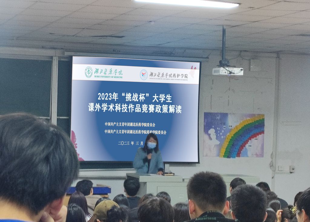 本网讯(通讯员 张雨)3月21日下午17:00,我校在2312阶梯教室举办“挑战杯”大学生课外学术科技作品竞赛政策解读讲座。校团委副书记邱爽、思想引领部科长郭俊、我校创新创业学院指导老师李海涛应邀出席,湖北医药学院、湖北医药学院药护学院200余名学生参加活动。