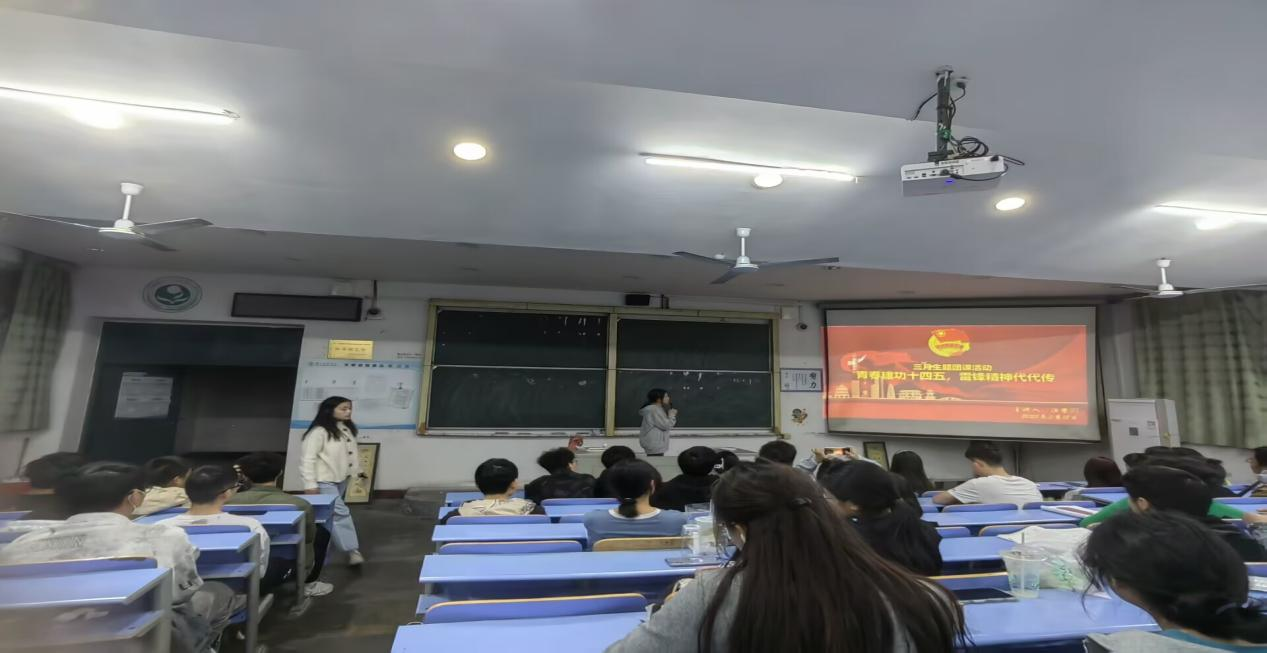 主题团日活动在庄严肃穆的国歌声中开始,依次进行诵读团章、宣讲雷锋精神内涵,重温入团誓词,高唱团歌等内容。各班宣讲人采用视频、理论文章相结合的方式,带领同学们学下《关于组织开展学雷锋志愿服务主题宣传实践活动的通知》和《关于在第24个"中国青年志愿者服务曰”前后开展青年志愿者服务社区行动的工作提示》等文件精神。在宣讲人的带领下,同学们不仅对雷锋助人为乐、无私奉献的精神有了深刻的认识,也进一步理解了雷锋精神的深刻内涵。