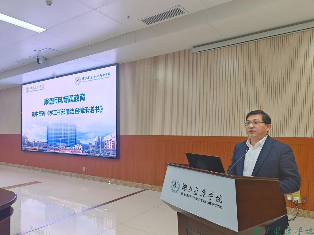 学生工作部部长陈璞解读了专题教育实施方案,详细介绍了“八个一”专项行动内容,领学了《新时代高等学校教师职业行为十项准则》等规章制度。全体与会人员共同观看了廉政警示教育片《陨落的青春》。