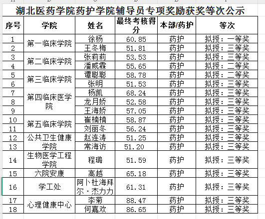 湖北医药学院药护学院辅导员专项奖励获奖等次公示